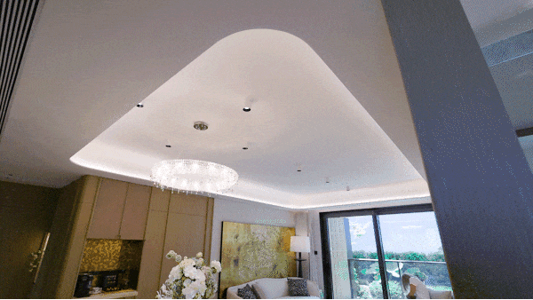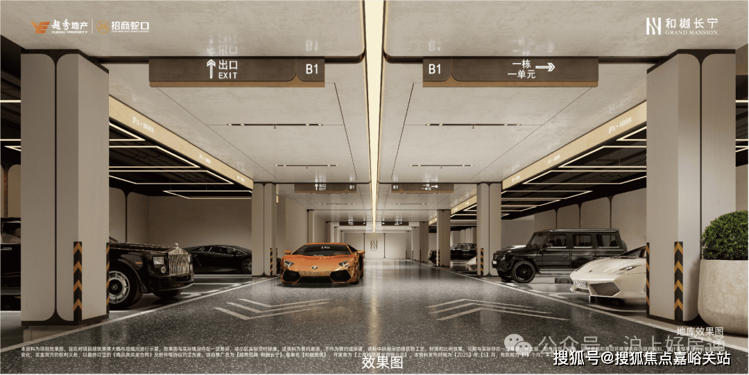 整个会所立体空间感十脚,每个车位上方还都有LED环抱灯吊顶,